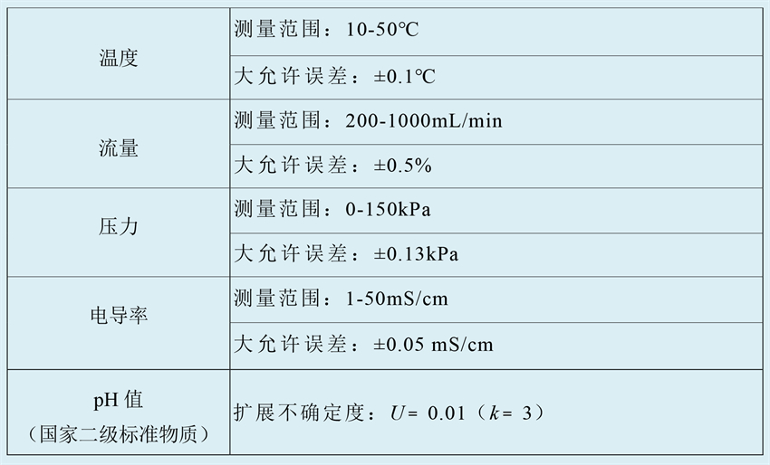 本校準裝置通過設(shè)計模擬血液透析裝置檢測儀實際工作狀態(tài)的液體循環(huán)回路,并在回路中整合用于校準血液透析裝置檢測儀溫度、流量、壓力、電導(dǎo)率和 pH 值參數(shù)的標準校準設(shè)備及國家二級標準物質(zhì),實現(xiàn)了對血液透析裝置檢測儀的溫度、流量、壓力、電導(dǎo)率、pH 值等多參數(shù)一體化校準。